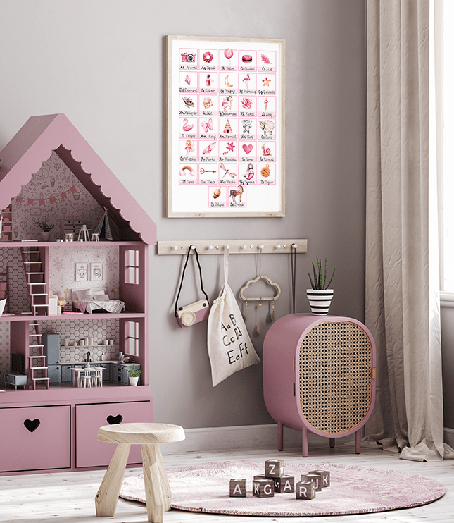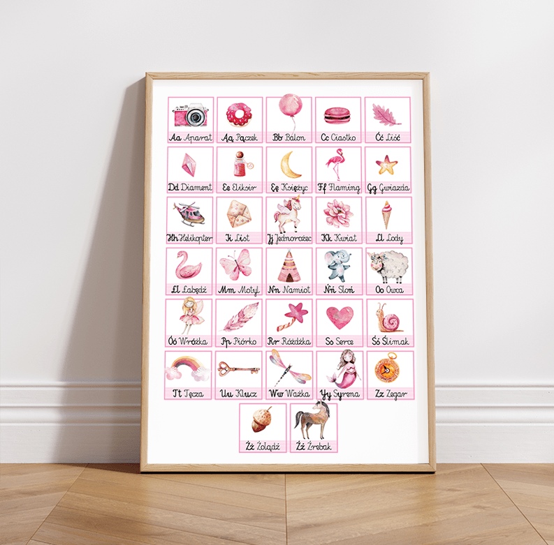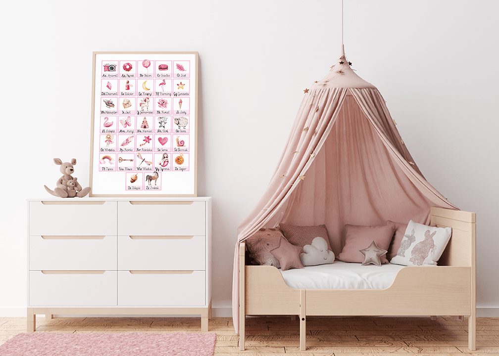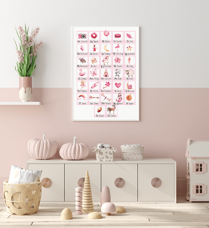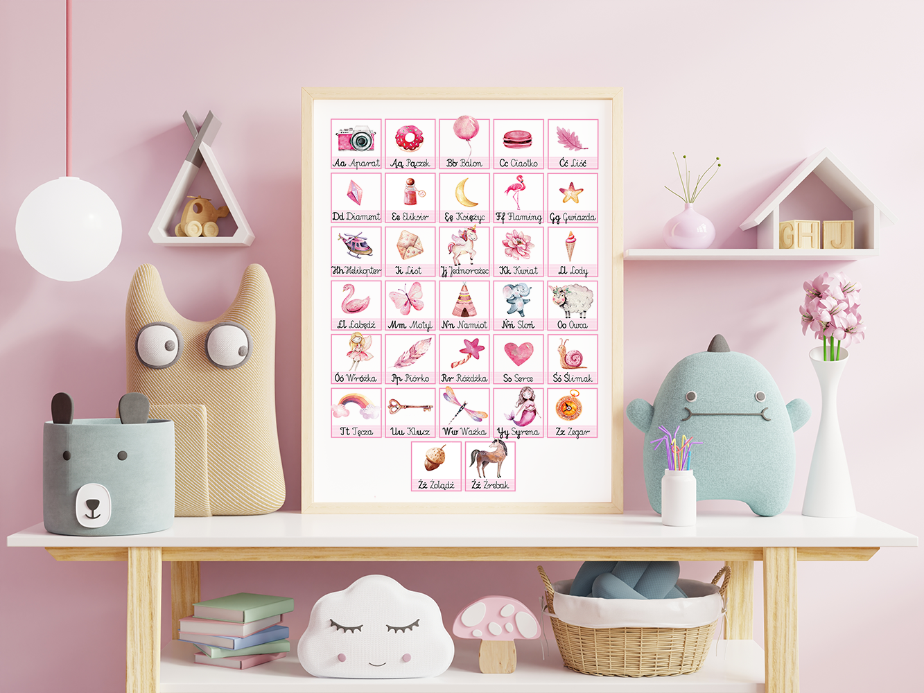 Plakat z alfabetem do pokoju dziewczynki to doskonały pomysł na połączenie edukacji z dekoracją wnętrza. Taki plakat może nie tylko wprowadzić element estetyczny do pokoju, ale także wspierać rozwój językowy dziecka. Plakat jest przyjazny i zawiera elementy, które przyciągną uwagę dziecka.