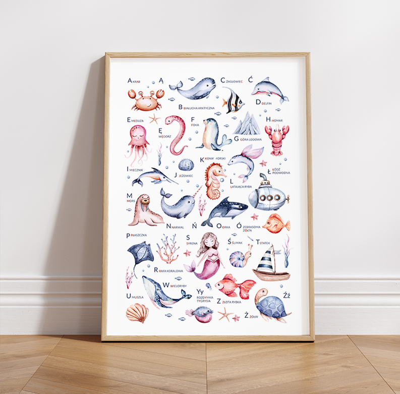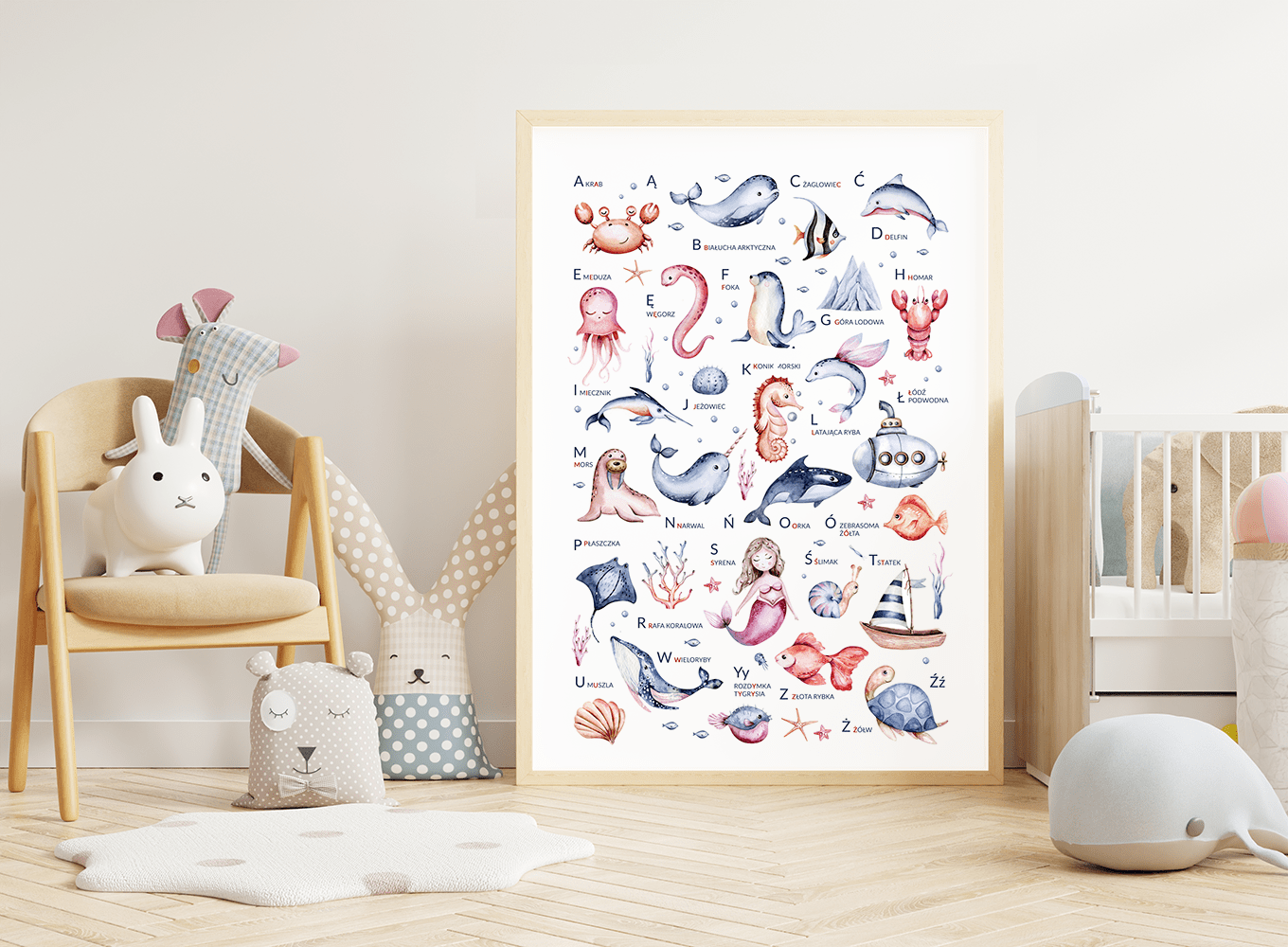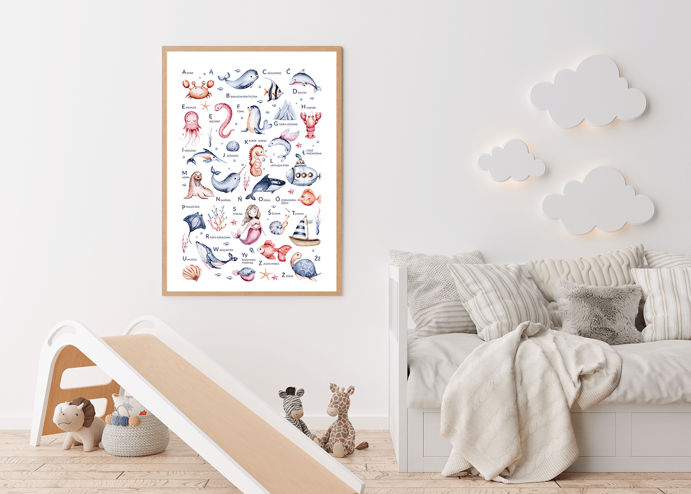 Plakat „Alfabet Oceaniczny” to idealne połączenie nauki i dekoracji. Każda litera została zilustrowana w formie uroczego bohatera z morskiego świata – od kraba i konika morskiego, po orkę i złotą rybkę. Dzięki temu alfabet staje się dla dziecka czymś więcej niż tylko literami – to fascynująca opowieść o oceanie i jego mieszkańcach.