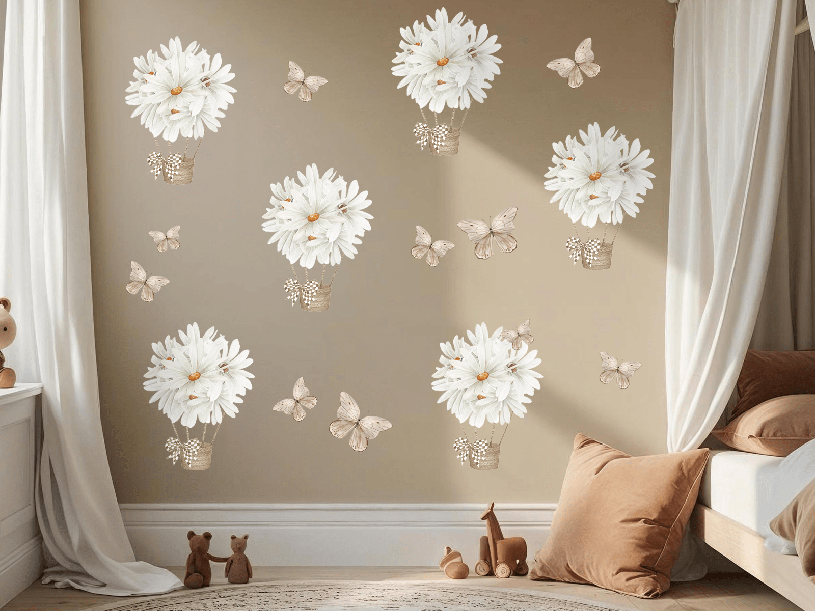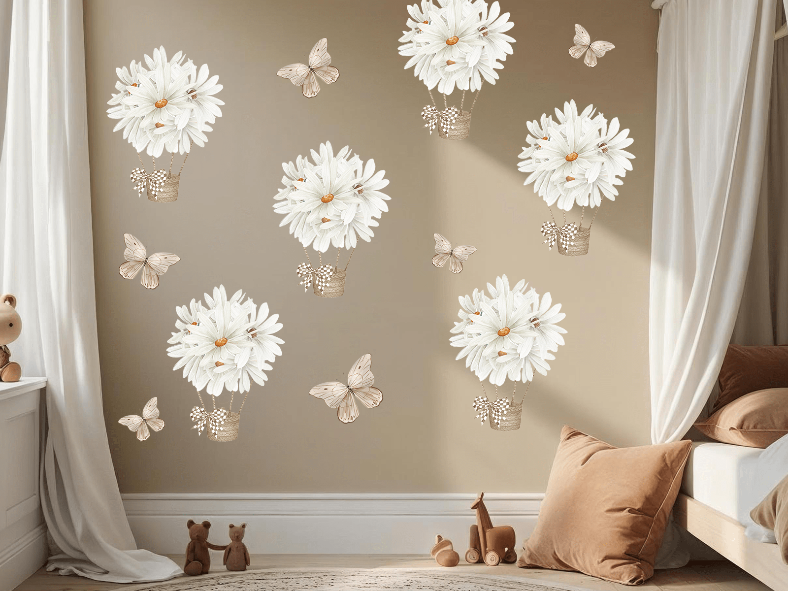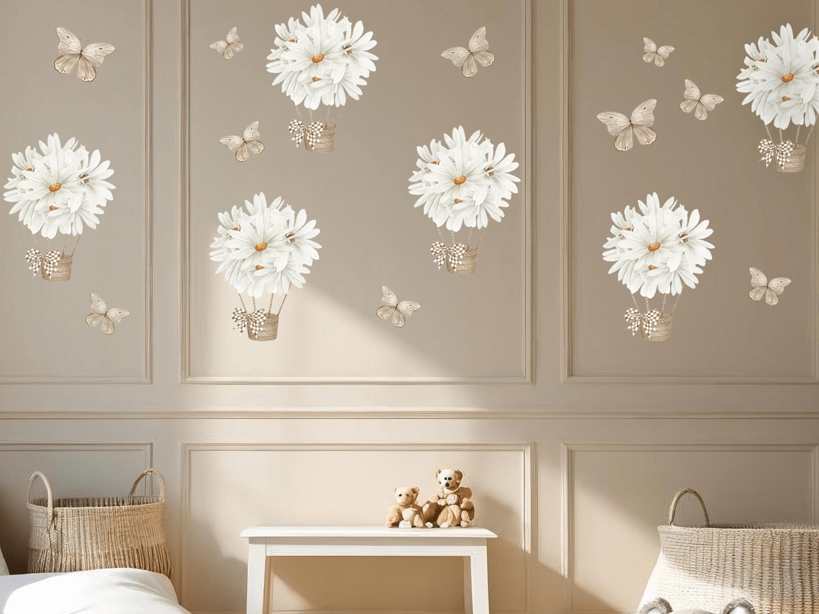 Zestaw naklejek ściennych „Stokrotki w balonach i motylki” to wyjątkowa dekoracja, która wprowadza do dziecięcego pokoju ciepło, spokój i naturalną lekkość. Delikatne białe stokrotki ułożone w formie balonów unoszących się w powietrzu oraz subtelne motylki w stonowanych beżach tworzą kompozycję pełną wdzięku i uroku. To wzór, który zachwyca swoją lekkością i ponadczasową prostotą – idealnie wpisuje się w estetykę stylu skandynawskiego, boho czy vintage.