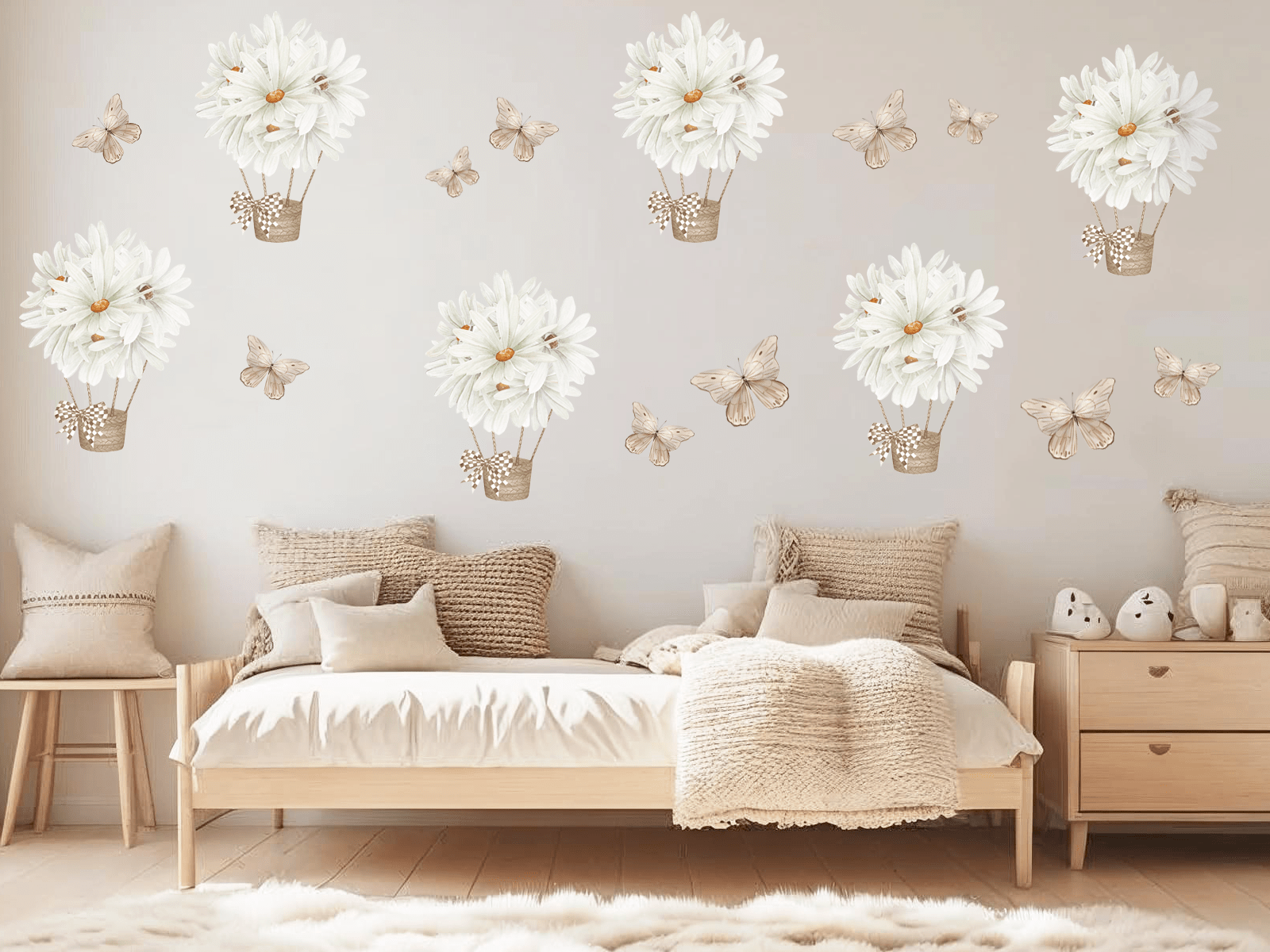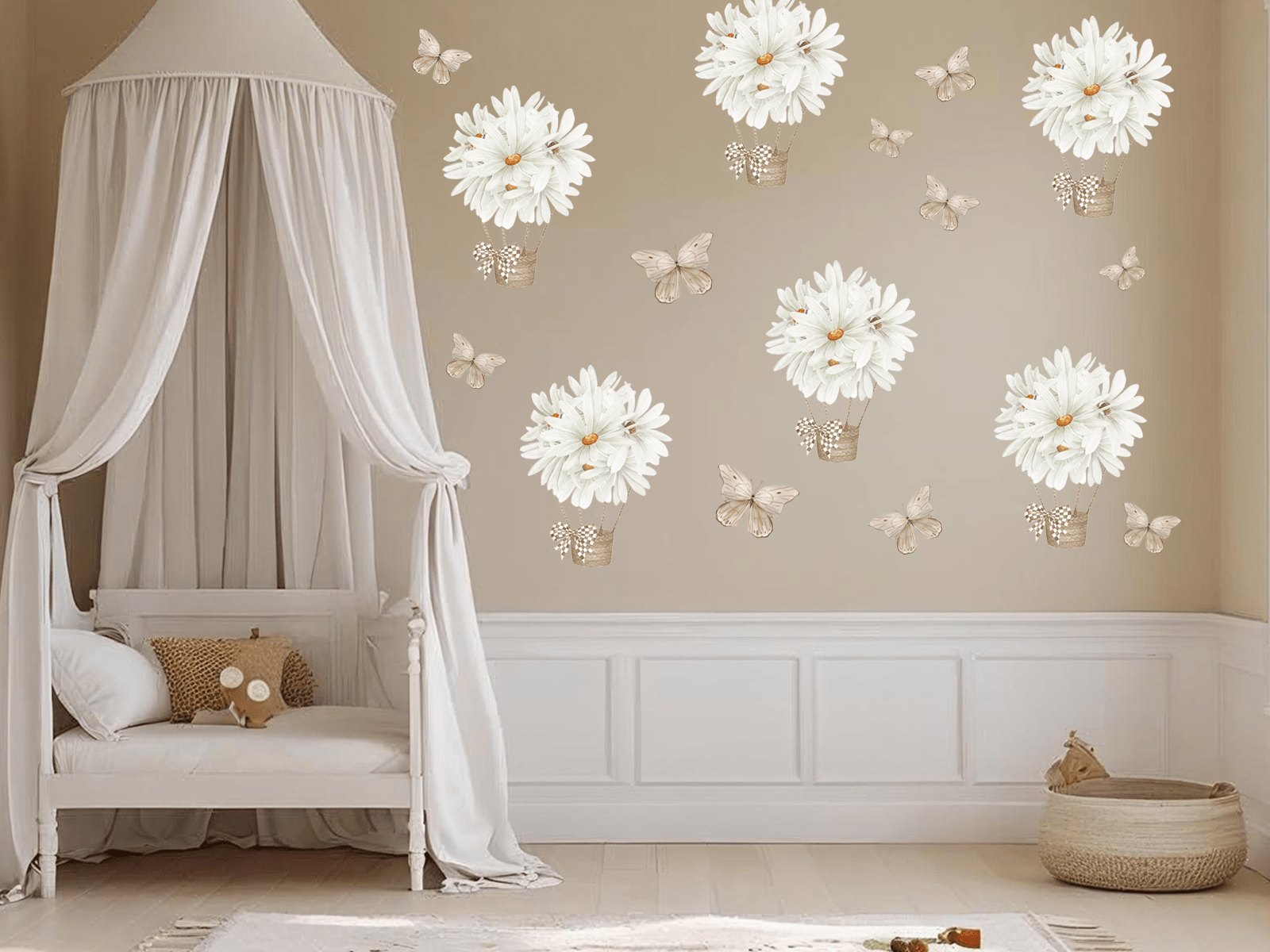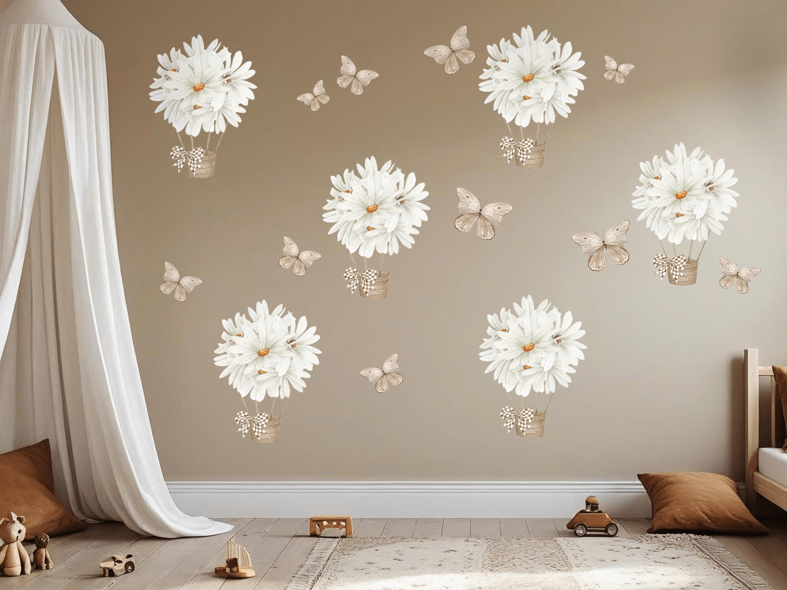Zestaw naklejek ściennych „Stokrotki w balonach i motylki” to wyjątkowa dekoracja, która wprowadza do dziecięcego pokoju ciepło, spokój i naturalną lekkość. Delikatne białe stokrotki ułożone w formie balonów unoszących się w powietrzu oraz subtelne motylki w stonowanych beżach tworzą kompozycję pełną wdzięku i uroku. To wzór, który zachwyca swoją lekkością i ponadczasową prostotą – idealnie wpisuje się w estetykę stylu skandynawskiego, boho czy vintage.
