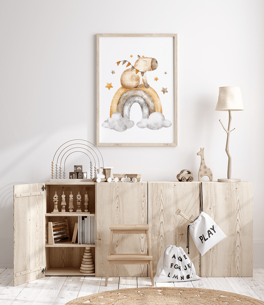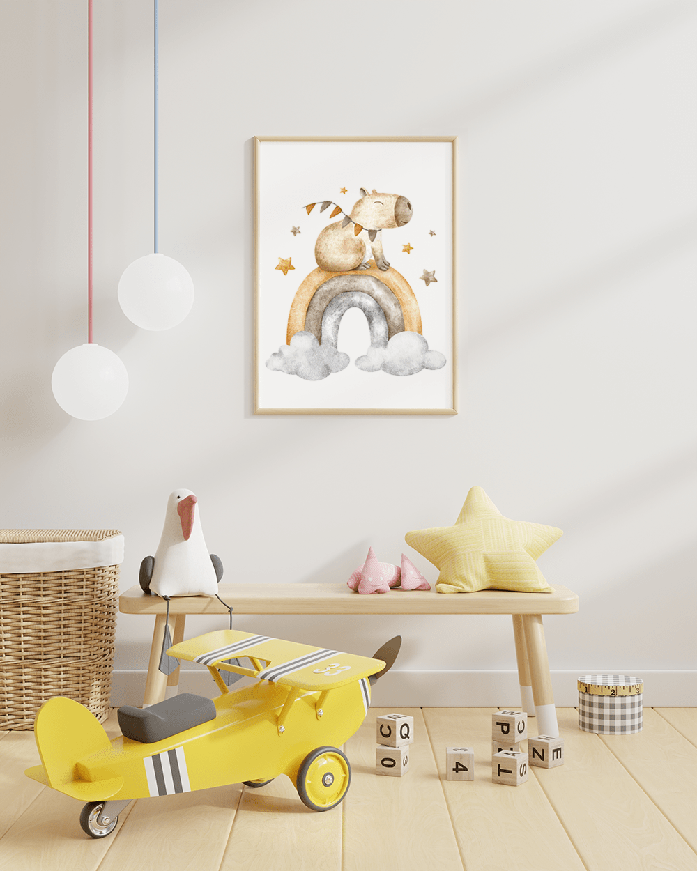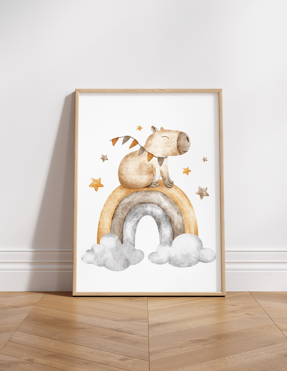 Odkryj urok natury w przyjaznej, bajkowej formie dzięki naszemu wyjątkowemu plakatowi Capybara. Ta sympatyczna kapibara, siedząca na subtelnej tęczy i otoczona delikatnymi gwiazdkami, wprowadza do pokoju dziecka spokój, harmonię i radosny klimat. Idealny do dekoracji ściennych, plakat Capybara łączy w sobie estetykę przyjazną dzieciom z eleganckim, stonowanym stylem, który sprawdzi się w każdym wnętrzu – zarówno w pokoju malucha, jak i w przestrzeniach rodzinnych.