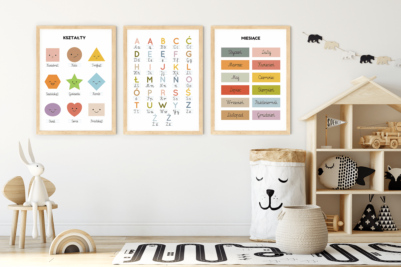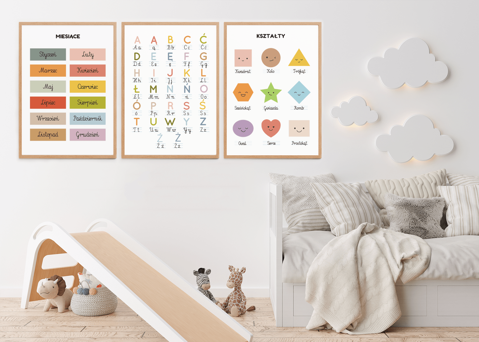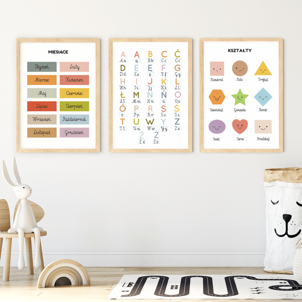 Zestaw edukacyjnych plakatów dla dzieci – alfabet, kształty i miesiące