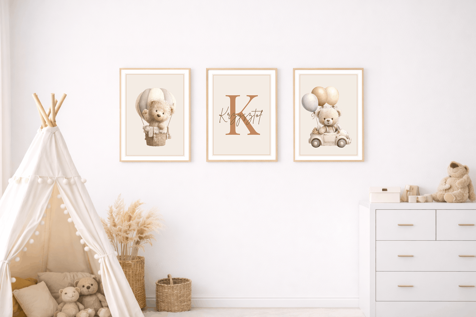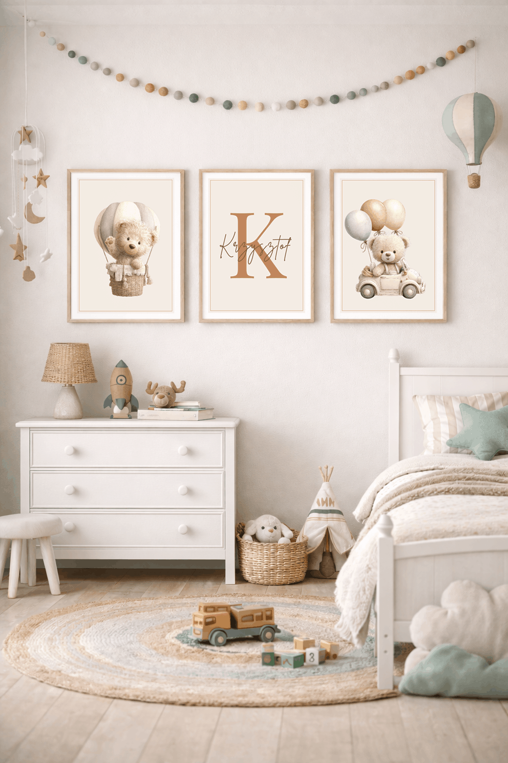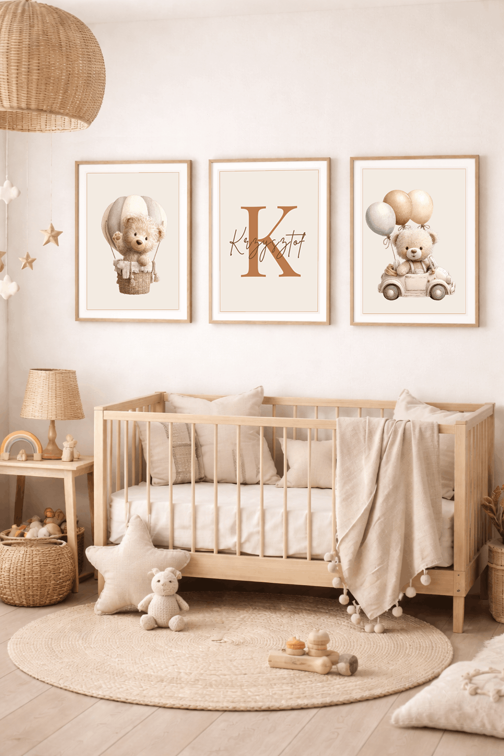 Stwórz wyjątkową, personalizowaną dekorację do pokoju dziecka dzięki autorskiemu zestawowi trzech plakatów z misiami w stylu boho. Centralnym elementem zestawu jest plakat z dużą literą oraz imieniem dziecka, który nadaje całości indywidualnego charakteru i sprawia, że aranżacja staje się niepowtarzalna.