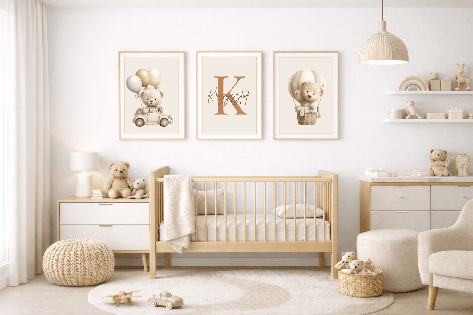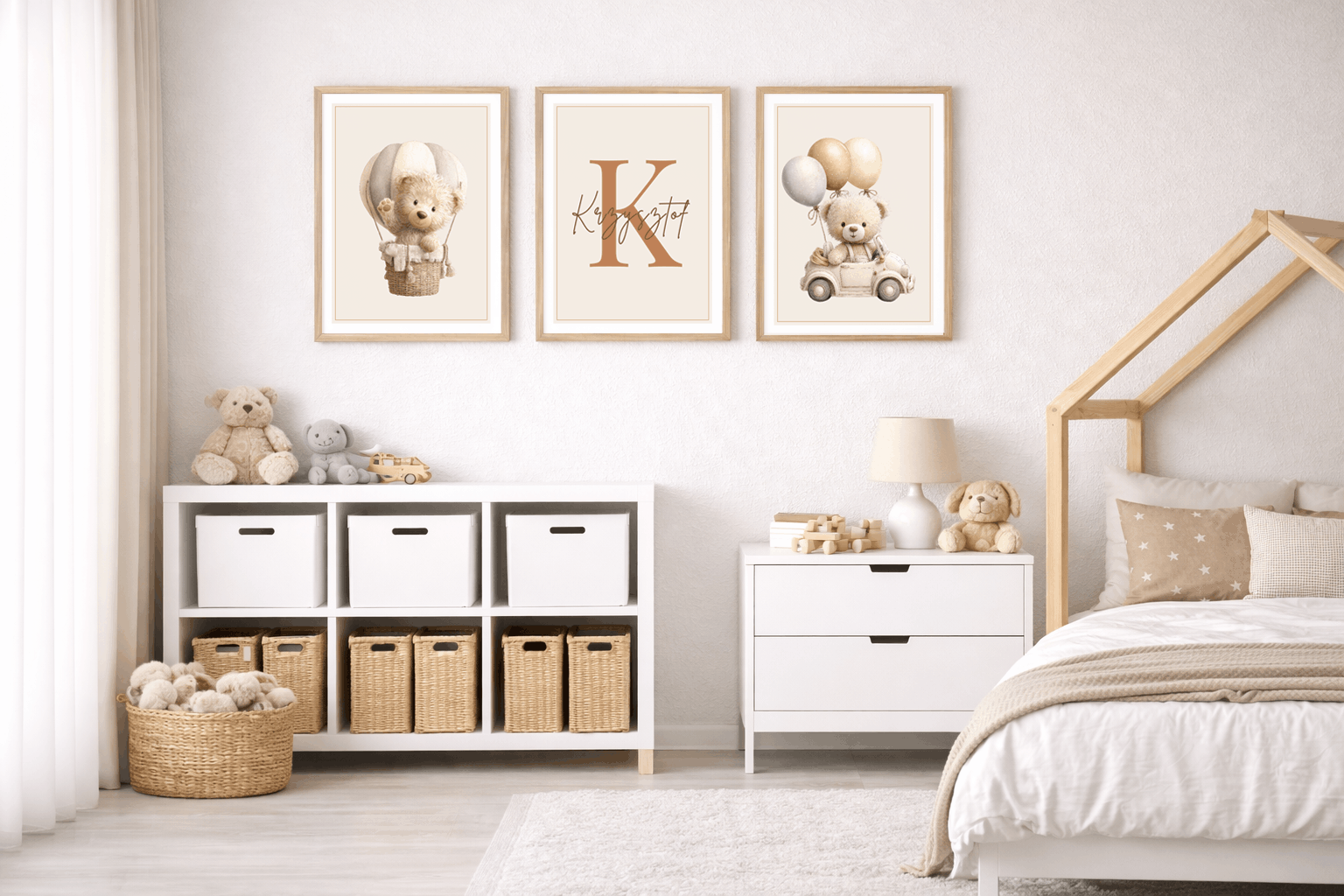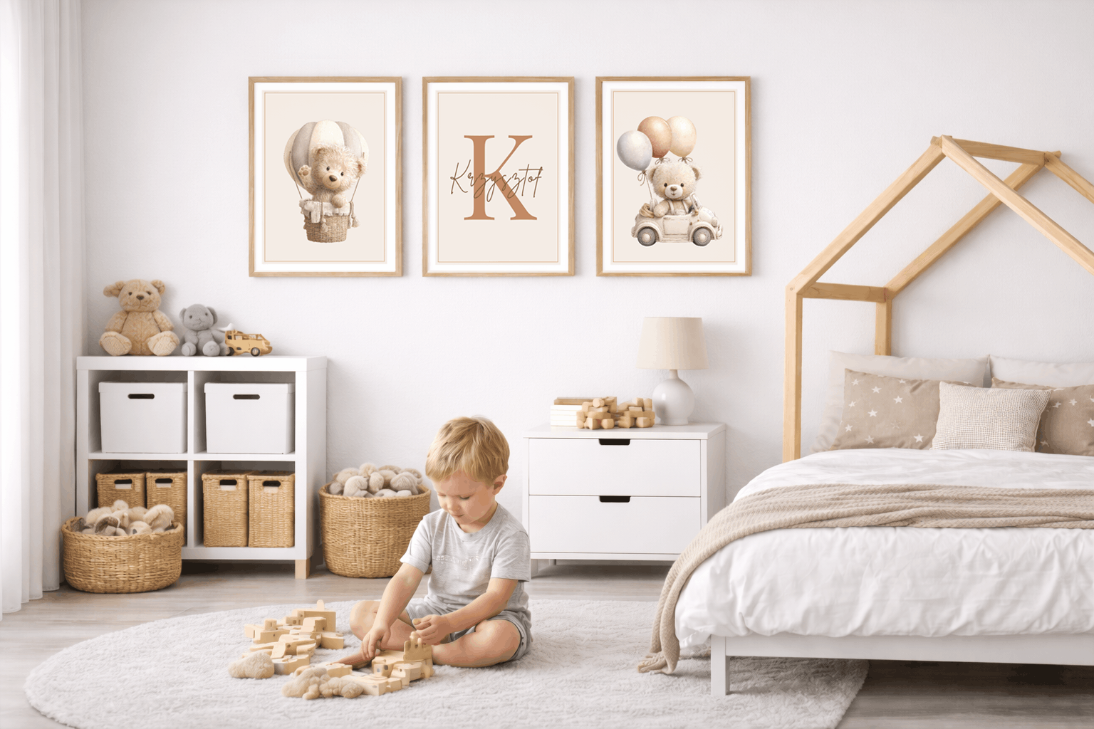 Stwórz wyjątkową, personalizowaną dekorację do pokoju dziecka dzięki autorskiemu zestawowi trzech plakatów z misiami w stylu boho. Centralnym elementem zestawu jest plakat z dużą literą oraz imieniem dziecka, który nadaje całości indywidualnego charakteru i sprawia, że aranżacja staje się niepowtarzalna.