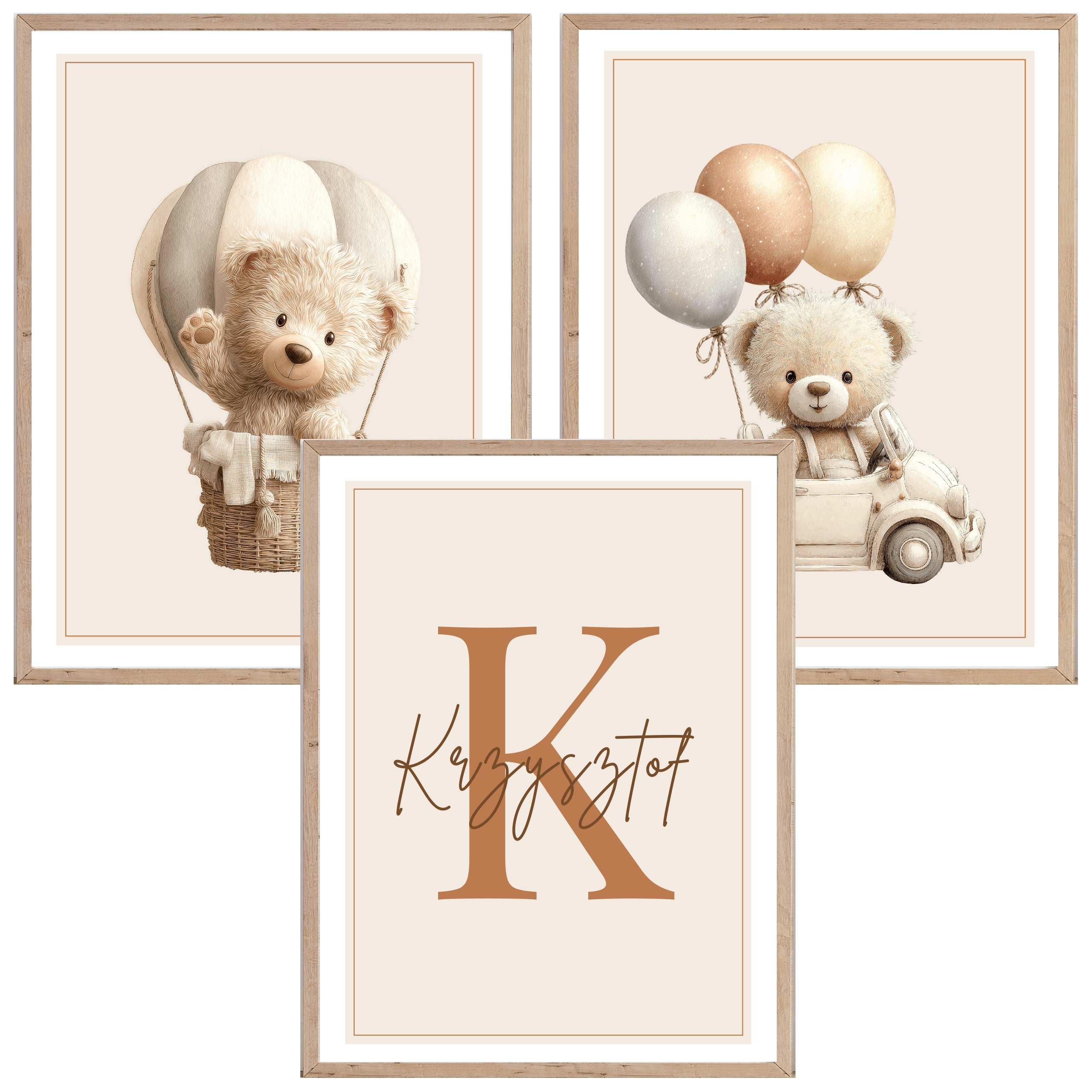 Zestaw 3 plakatów dziecięcych z imieniem MISIE BOHO – personalizowany | balon, literka, samochód