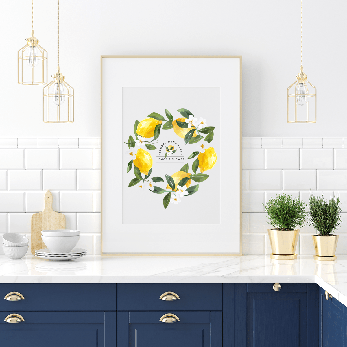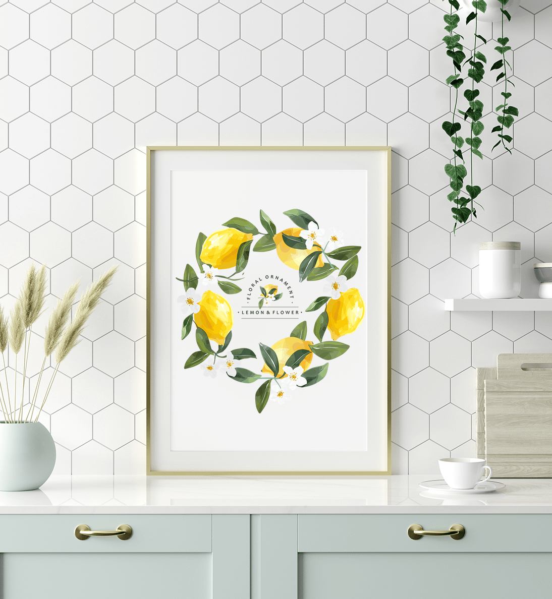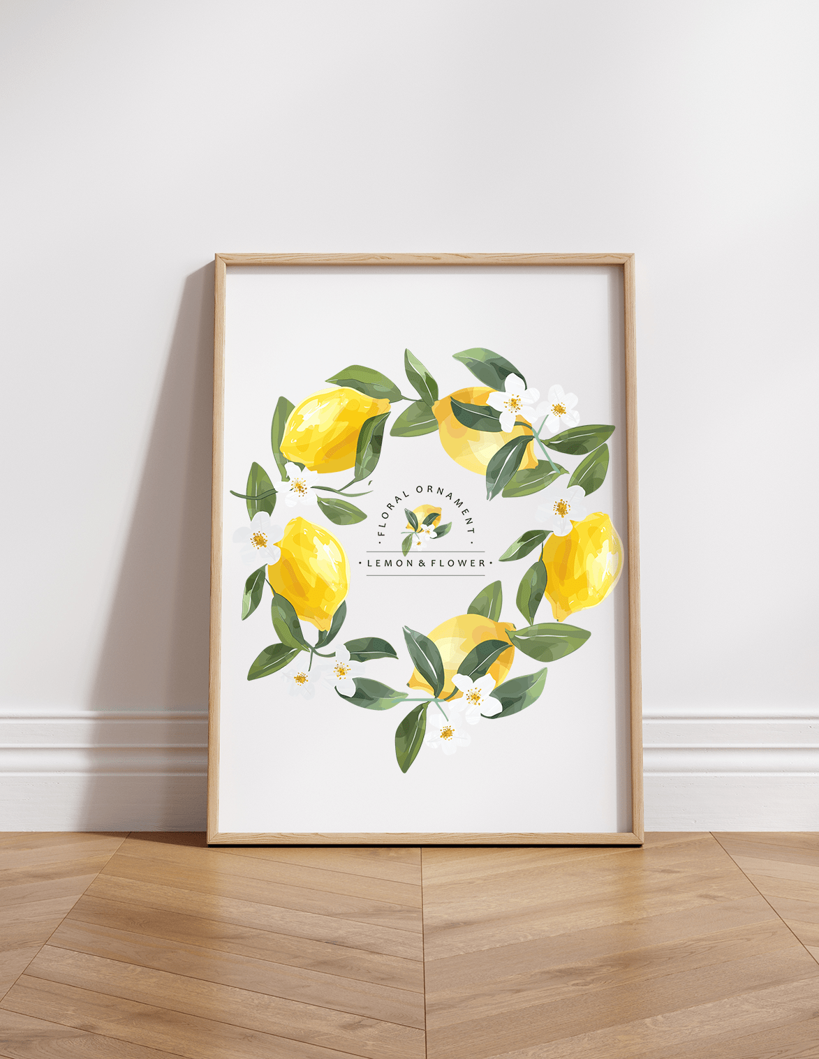 Plakat z cytrynowym wieńcem to elegancka, subtelna dekoracja o ponadczasowym charakterze. Kompozycja w kształcie koła symbolizuje harmonię, spokój i piękno natury. Dzięki jasnemu tłu i dopracowanym szczegółom sprawdzi się w różnych pomieszczeniach – od kuchni po salon.