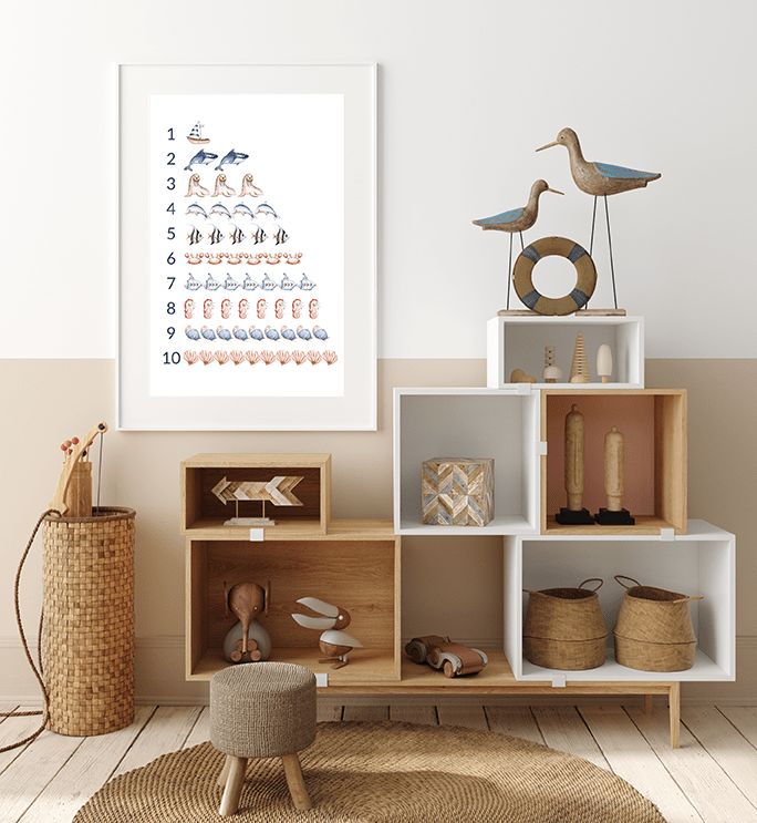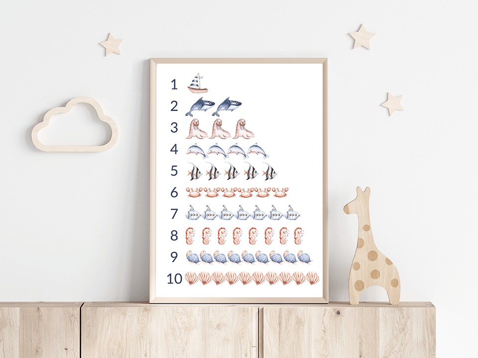 Plakat z liczbami w stylu marynistycznym do pokoju dziecka, to połączenie edukacyjnych elementów z estetyką nawiązującą do morza i przygód.